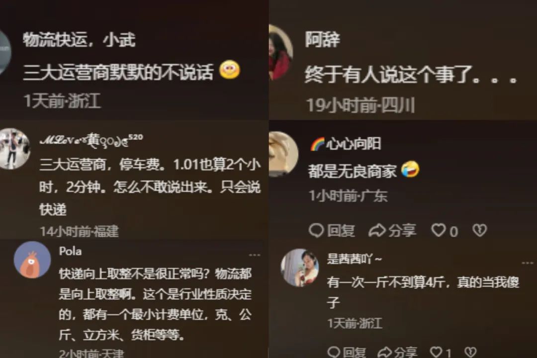 不过网友对“向上取整”的看法各不相同。一部分网友表示:“无良商家”“终于有人说这个事了”,另一部分网友则表示习以为常了,况且这类现象并不只存在于快递行业,三大运营商、停车费等其他行业同样如此,有点见怪不怪了。