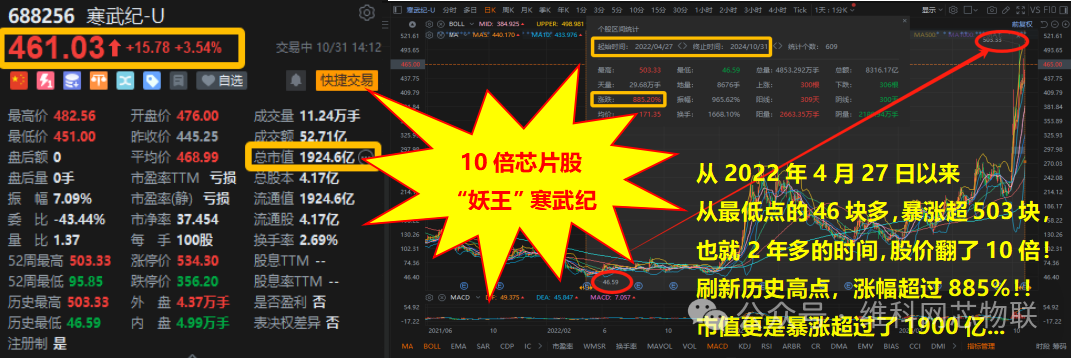 从2022年4月底以来,股价从最低46.59元/股,暴涨至最高503.33元,突破了上市以来的历史最高点!!股价翻了10倍多,已经是妥妥的十倍股了!!