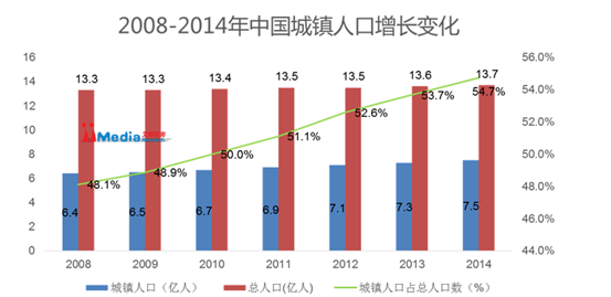 城镇人口是互联网+社区发展的前提和基础。根据国家统计局数据显示,2008年城镇人口数为6.4亿人,至2014年增至7.5亿人,占总人口数比例从48.1%上升至54.7%。随着我国城镇化速度的不断加快,社区商业和社区建设将成为未来主要发展趋势之一。