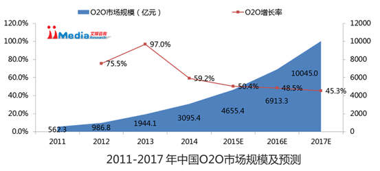 iiMediaResearch(艾媒咨询)数据显示,2014年中国O2O市场规模已达3095.4亿元,预计2015年国内O2O市场规模将超过4600亿元。