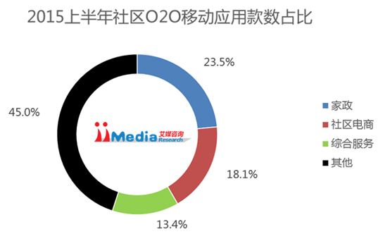 iiMediaResearch(艾媒咨询)数据显示:截止2015年上半年,已经上线的各类社区应用中,家政类APP占23.5%,社区电商类APP占18.1%,综合服务APP占13.4%,其他占45.0%。这说明目前中国社区O2O业态还处于混沌状态,社区内各类业务都有可能经互联网化进行资源整合,进行业态的再升级。