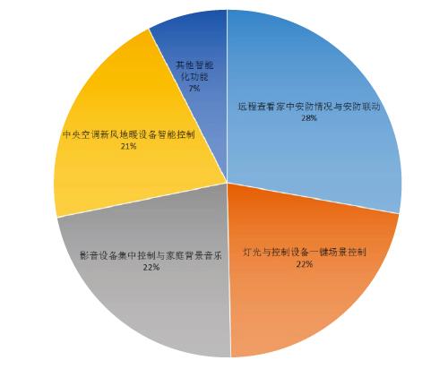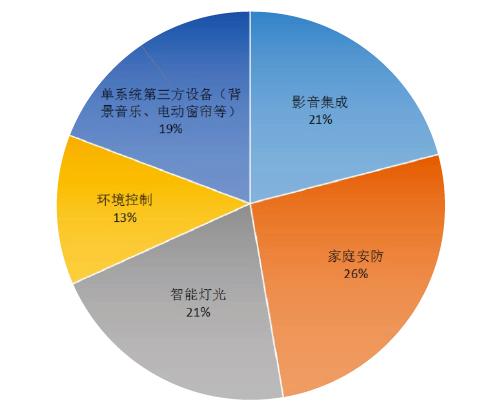 问卷调查显示,在现阶段用户接受度较高的智能家居集成应用功能中,影音集成、家庭安防、智能灯光以及以背景音乐、电动窗帘等为代表的单系统第三方设备占比相当,成为当下智能家居集成项目应用的主要功能延伸。家庭安防因其突出的刚性需求要素,成为不少终端用户在智能家居功能选择时的首选要素。影音集成和智能灯光系统则凭借各自在细分功能化领域中的特色应用备受关注。