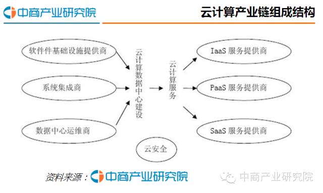 云计算提供的内容从IT基础设施到上层应用,横跨IT(信息业)和CT(通信业)两个领域。云计算产业链分为后端云计算数据中心建设、前端云计算服务以及云安全三个部分。云计算数据中心建设领域主要参与厂商为软硬件基础设施提供商、系统集成商和数据中心运维商。云计算服务领域有IaaS服务提供商、PaaS服务提供商和SaaS服务提供商。