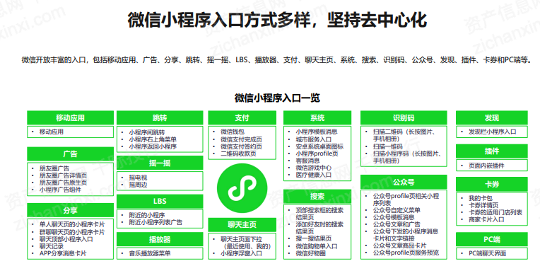 微信小程序入口方式多样,坚持去中心化。微信开放丰富的入口,包括移动应用、广告、分享、跳转、摇一摇、LBS、播放器、支付、聊天主页、系统、搜索、识别码、公众号、发现、插件、卡券和PC端等