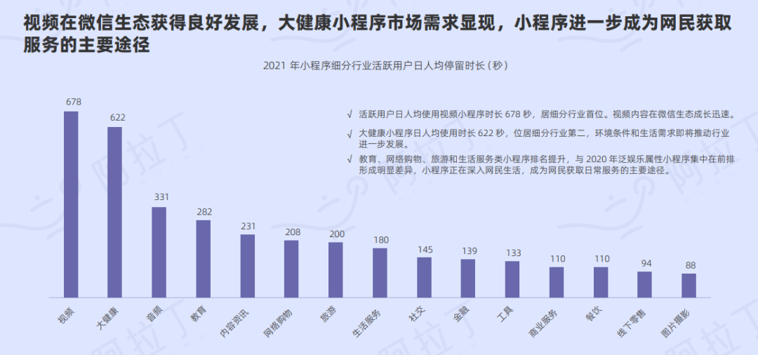 根据阿拉丁研究院发布的数据显示,2021年小程序访问次数分布中,生活服务类小程序占比最高,在6月份接近访问占比的50%。同时根据活跃用户停留时长显示,视频在微信生态获得良好发展,大健康小程序市场需求显现。具体表现在,活跃用户日人均使用视频小程序时长 678 秒,居细分行业首位。大健康小程序日人均使用时长 622 秒,位居细分行业第二,环境条件和生活需求即将推动行业进一步发展。此外,教育、网络购物、旅游和生活服务类小程序排名提升,与 2020 年泛娱乐属性小程序集中在前排形成明显差异。可见小程序正在深入网民生活,成为网民获取日常服务的主要途径