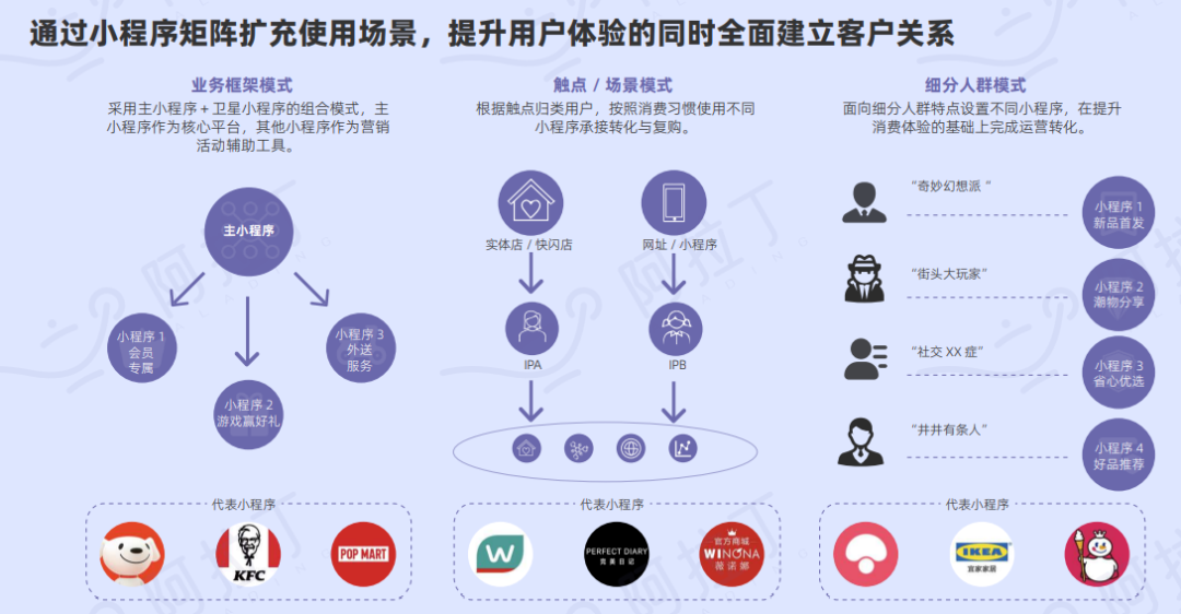 (2)触点/场景模式,如屈臣氏、完美日记、薇诺娜所采用的小程序,该模式根据触点归类用户,并按照消费习惯使用不同小程序承接转化与复购。