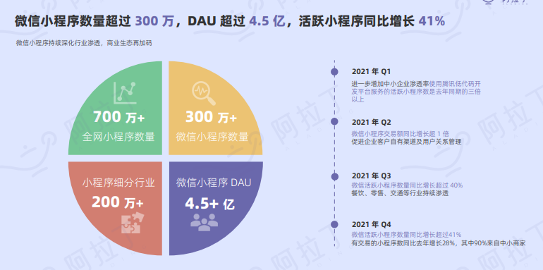 据对公开资料进行统计,2021年全网小程序数量已超700万,其中微信小程序开发者突破300万,小程序DAU已超4.5亿;日均使用次数同比增长32%,活跃小程序则增长41%,小程序生态已塑造出新的增长空间。