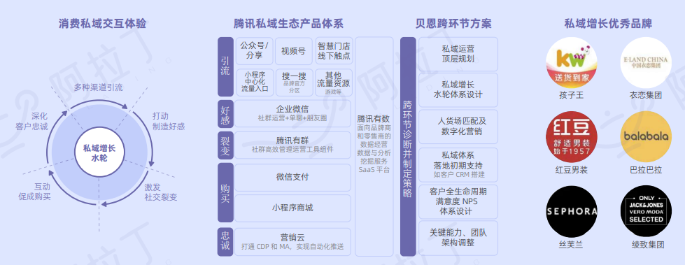 以母婴品牌孩子王为例,从母婴育儿产品到亲子家庭服务,孩子王借助微信生态打破线上线下壁垒,构建私域闭环:育儿顾问通过近5万个活跃社群提供专业答疑服务,借助签到打卡促进社群活跃,精准推送和积分促进用户消费及复购。目前孩子王小程序已经与APP、线下门店同步, 沉淀线上线下会员超5000万,实现有效私域增长。
