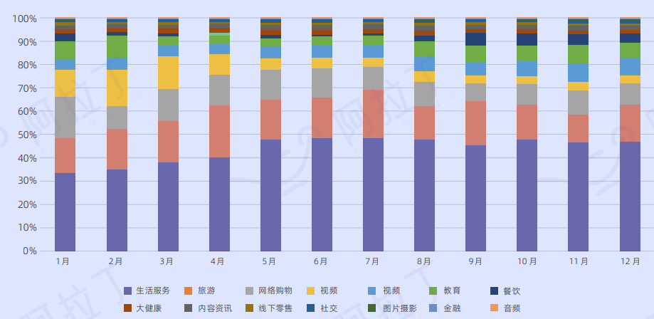 细分行业分布变化中:头部小程序(MAU>500万)细分行业分布趋于均衡,生活服务类占比17.8%,手机游戏占比13.3%。支付宝小程序依托支付宝的商业和生活服务基因,小程序细分行业分布也以生活服务、金融保险和电商等小程序为主。