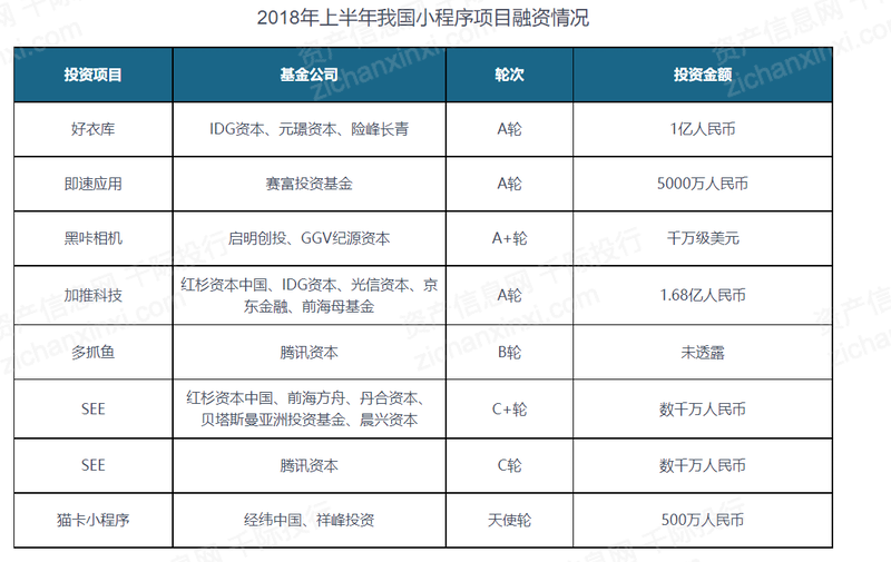 近一年多来小程序一直是风口上的话题,资本圈的关注也随之而来,投资人开始疯狂布局,市场中80%一线基金已经入场,其中包括红杉中国、IDG、真格基金、险峰长青、腾讯资本等。有赞融资上市,目前市值70亿,专门为客户提供小程序微商城等一系列SaaS服务,最后一轮由腾讯领投;腾讯投资微盟小程序服务商微盟也被成为“小程序服务商第一股”,微盟小程序提供零售、到店、展示、餐饮及智慧餐厅、本地化社会服务等多种基于小程序的解决方案,最终在香港上市,市值近80亿。即速应用,微信小程序开发工具网站,2019年1月完成5000万的A+轮融资。