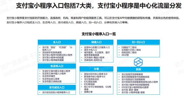 支付宝小程序入口包括7大类,支付宝小程序是中心化流量分发主入口、生活号入口、支付成功入口、频道入口、扫一扫入口、分享和系统入口等等。因此,支付宝小程序流量入口相对较少,并且以自家的体系内的为主,微信小程序流量入口较多,并且相对开放一些。