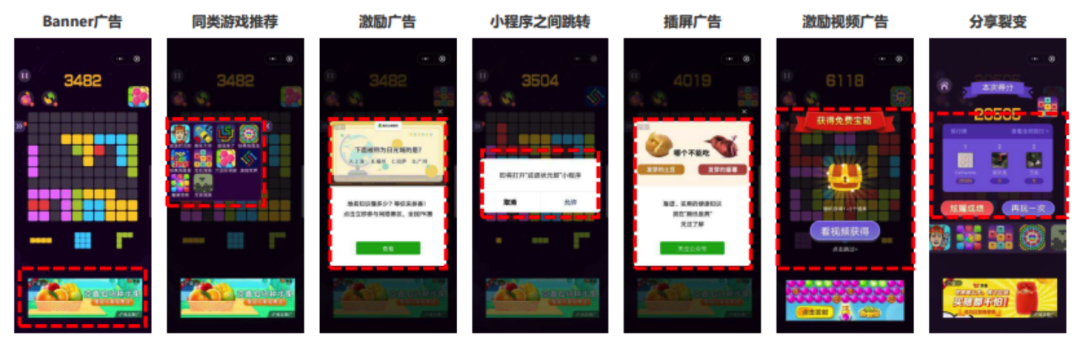 同时,这种微信广告组件全量开放也带来了更多变现可能,以最简单的休闲消除类微信小游戏俄罗斯消除为例,打开游戏之后底部有banner广告,左侧有固定位置推荐同类小游戏,游戏途中有各类激励答题和关注公众号的广告,达到一定分数之后有激励视频广告,游戏结束有分享裂变广告等等。