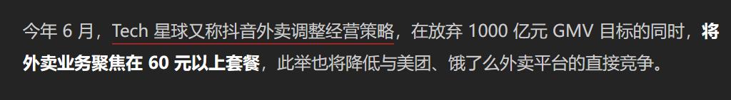 首先是在外卖业务上,抖音曾经更偏向于使用“团购配送”这样的字眼,2023年6月有媒体称抖音本地生活调整了策略:“将外卖业务聚焦在 60 元以上套餐”;以及现在“外卖”业务板块被放在了抖音团购页次级菜单栏的左滑第二页,入口之深更满足刷到视频即时消费,及有特定团购配送需求的用户。