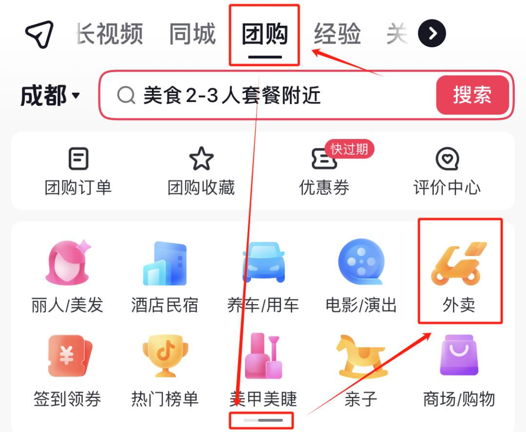 首先是在外卖业务上,抖音曾经更偏向于使用“团购配送”这样的字眼,2023年6月有媒体称抖音本地生活调整了策略:“将外卖业务聚焦在 60 元以上套餐”;以及现在“外卖”业务板块被放在了抖音团购页次级菜单栏的左滑第二页,入口之深更满足刷到视频即时消费,及有特定团购配送需求的用户。