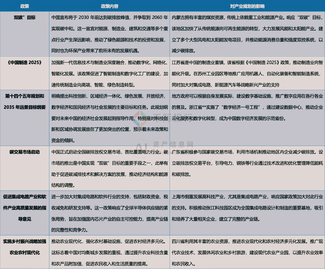 就目前而言,近两年来,中国的产业政策聚焦于推动高质量发展、加快科技创新、推进环保和绿色发展以及促进区域经济一体化等方面。国家级的政策对地方的产业规划有着指导性的作用,具体作用和具体政策如下: