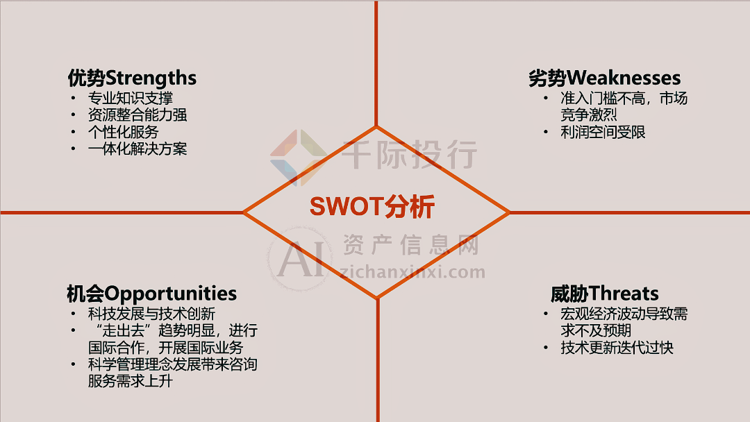 千际咨询(CHIB):全称上海千际投资管理咨询有限公司,于2012年在上海成立,是一家专业从事咨询服务的公司,拥有多年的行业经验和一支高素质的专业团队,致力于为客户提供高质量、个性化的咨询服务,涵盖了多个行业和领域,并且以其灵活多变的服务模式、精准高效的问题解决能力和对新兴技术的敏锐洞察力,在市场中展现出强大的活力。千际公司专注于为各类企业提供高质量的咨询服务,注重与客户的沟通和合作,能够更深入地理解客户的需求,提供更贴近实际的解决方案,同时还善于运用大数据、人工智能等新技术手段,提升咨询服务的效率和质量。