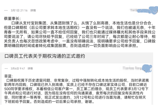 5天后,又有员工代表致信阿里巴巴集团资深人力资源总监石旻(花名:菲蓝),邮件中明确要求,3月12日下午两点和公司对话。致信石旻的原因,一则他是口碑老人,二来职能对口。