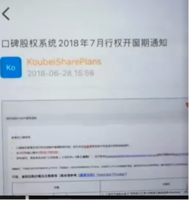 前文提到口碑在2017年与2018年曾开放过两次回购窗口。根据当时一份回购邮件可知,整个过程需要经历六个环节,分别是本人境外账户准备、公司触发行权开窗通知、员工提交行权通知、足额缴纳本金及手续费、足额缴纳税金,最后行权成功确认。