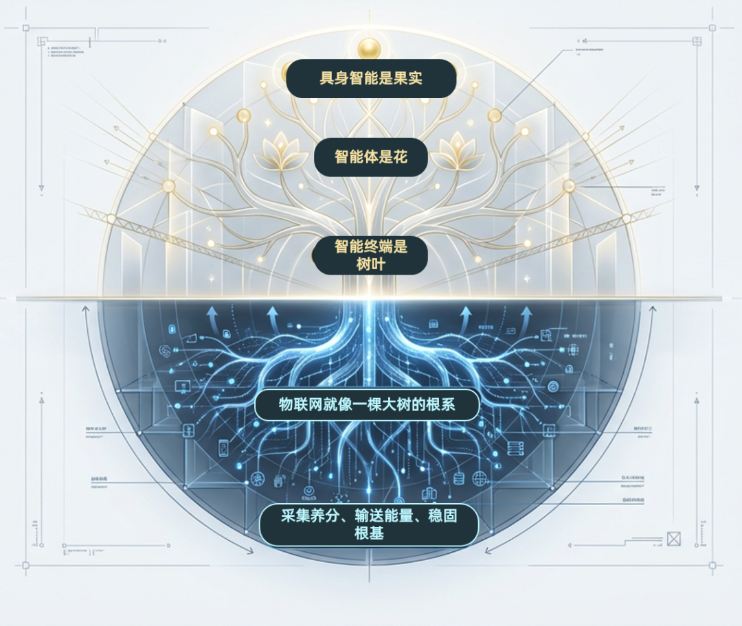 物联网就像一棵大树的根系。根系越发达、扎得越深,地面上看到的就越少,但整棵树的繁茂完全依赖于此。智能终端是枝叶,智能体是花,具身智能是果实,而物联网就是地下的根系,采集养分、输送能量、稳固根基。没有根系的支撑,所有的繁花都不可能绽放。