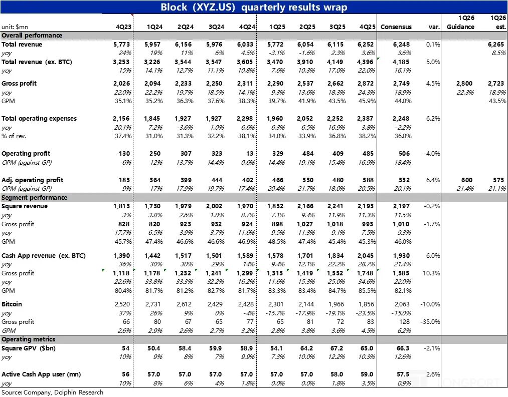 15美版支付宝——Block2月27日美股盘后,宣布了 2025 年的 4 季度财报,相比业绩表现,突然宣布整体裁员 40% 的爆炸消息更加的抓人眼球,部分受此驱动业绩后股价直升 20% 以上。 我们照例还是先分析下当季业绩表现,后续在观点讨论中再来谈谈对这近乎把公司 “砍掉一半” 大胆举措的看法: 1、核心营收和调整后利润都好于预期:整体业绩上,剔除比特币后的...