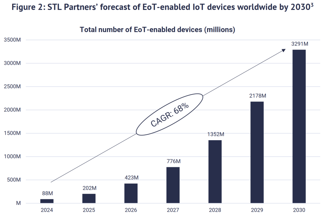 STL Partners预测,从2024年到2030年,EoT设备的数量将以70%的年复合增长率激增,至物联网设备总数的10%,其中高达20%将通过蜂窝网络连接。