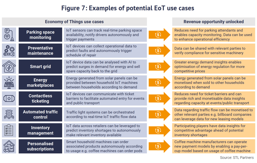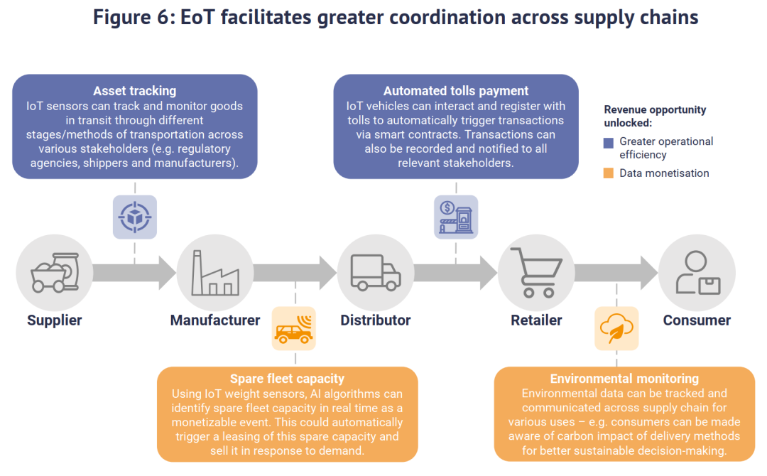 EoT的未来潜力不仅局限于联网车辆和供应链。让我们简洁地探讨其他几个潜在应用,它们如何利用智能技术和IoT设备优化效率并创造经济价值,如上图所示: