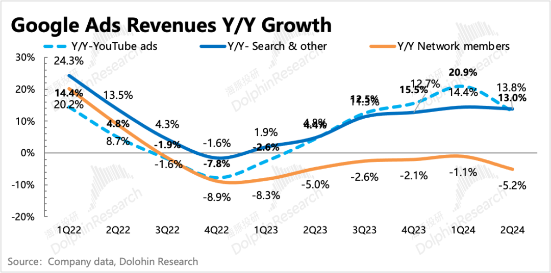 海豚君观点二季度在仍然还算强劲的宏观环境下,广告巨头的当期业绩多半不会差,其中搜索广告与YouTube广告的表现刚好抵消。YouTube广告增长表现不佳很好归因,但搜索广告为何强劲,市场并没有清晰的认知,公司解释为Performance Max和AI搜索驱动广告效果的提升。并且基于这个因素,在5月I/O大会上正式推出AI overview(原SGE)后,公司对搜索业务的增长前景也非常乐观。