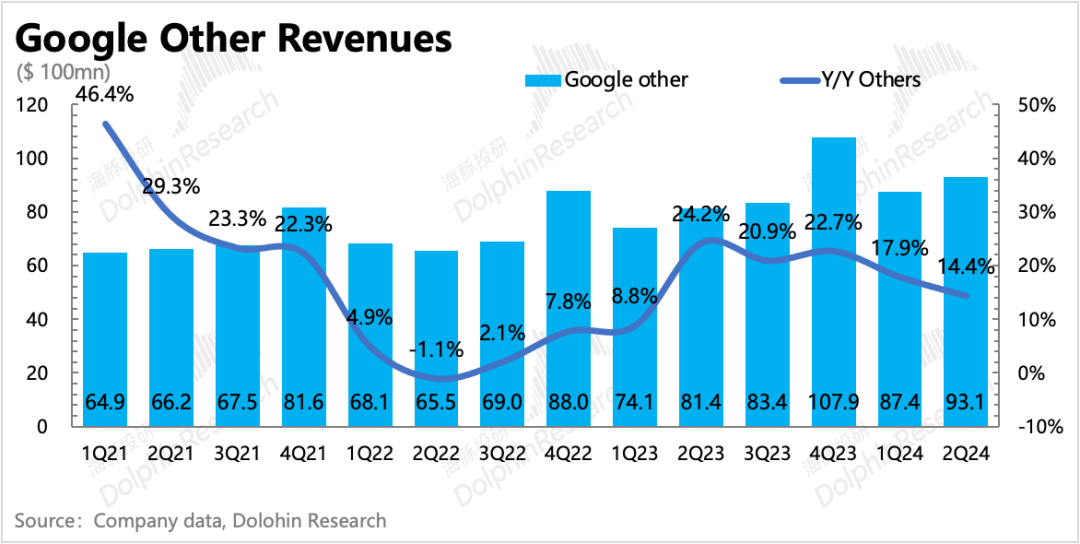 (3)其他业务:二季度增速进一步放缓,同比增长14%。这部分收入主要由YouTube订阅(TV、音乐等)、Google Play、Google、One、硬件(手机Pixel和智能家电Nest)等组成。近两个季度的增长支撑力来自于YouTube订阅,去年二季度,YouTube会员涨价,但TV收视份额却在稳步提升,使得订阅收入保持了高增长趋势。不过涨价带来的基数红利在二季度之后也就结束了,因此其他业务同样面临着高基数压力。