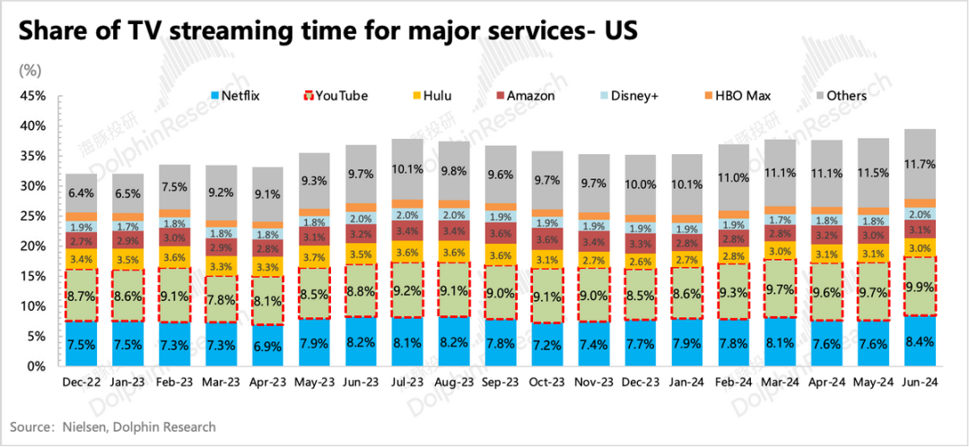 而对于YouTube广告增速放缓,管理层归因于Q2的同比高基数问题,高基数来源于亚太零售商去年Q2开始在YouTube上的投放,到今年Q2刚好基数红利期结束。海豚君认为基数问题不能解释全部,猜测还有更多的C端时长迁移到短视频的持续性影响,一方面Reels、TikTok外部竞争,另一方面YouTube内部流量也更多的倾斜到Shorts上,但Shorts的变现能力不如中长视频贴片广告,也就是内部侵蚀拖累整体增长。此外YouTube TV可能也受到了来自Netflix和Amazon prime的影响。虽然YouTube TV的收视份额持续有优势,但Netflix和Amazon Prime TV以往并没有推行广告变现,因此过去并不存在广告上的竞争,但现在YouTube TV也需要打起精神应对。