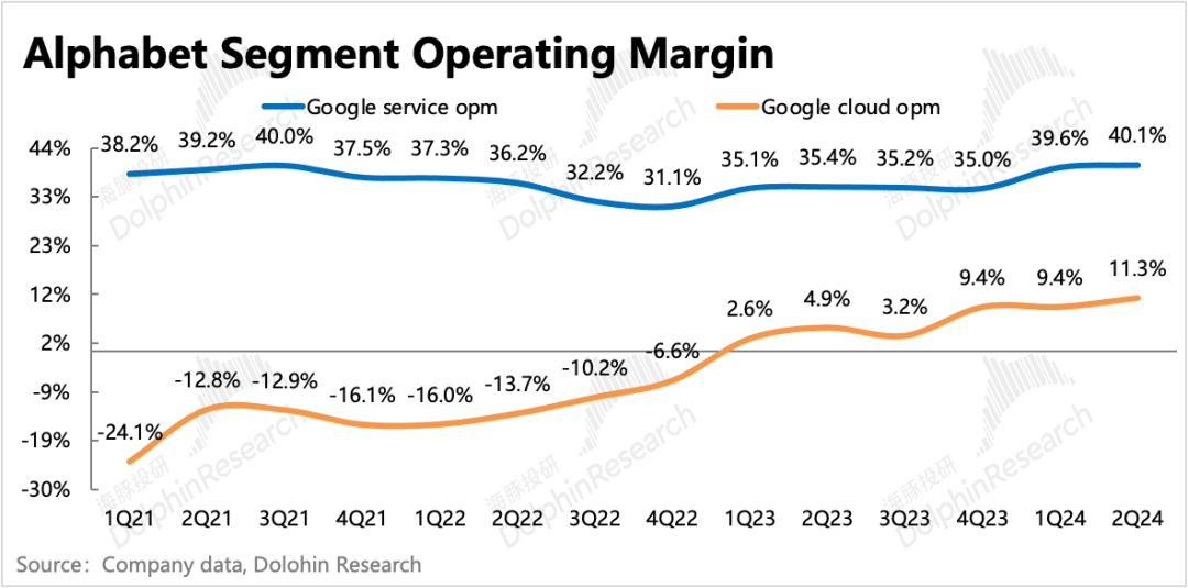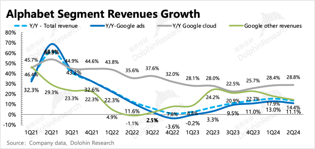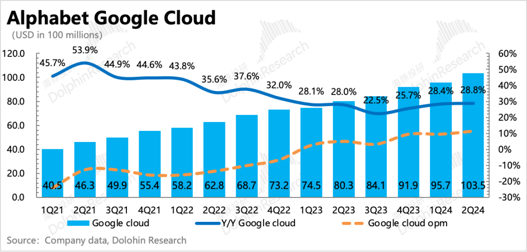 (2)Cloud:二季度实现103亿收入,同比增速28.8%,高增速趋势非常稳定。云业务是能够清晰感知到AI对收入的拉动,公司提及目前AI部分的创收已经达到几十亿的水平,这个占比提升的速度已经很快,说明企业客户对AI云的采纳是比较积极的。截至二季度,谷歌为云客户提供的AI基础设施和GenAI解决方案已经创造了数十亿美元的收入,被超过200万开发人员使用 。除此之外,云部门的高增长仍然还有Google Workspace的拉动,
