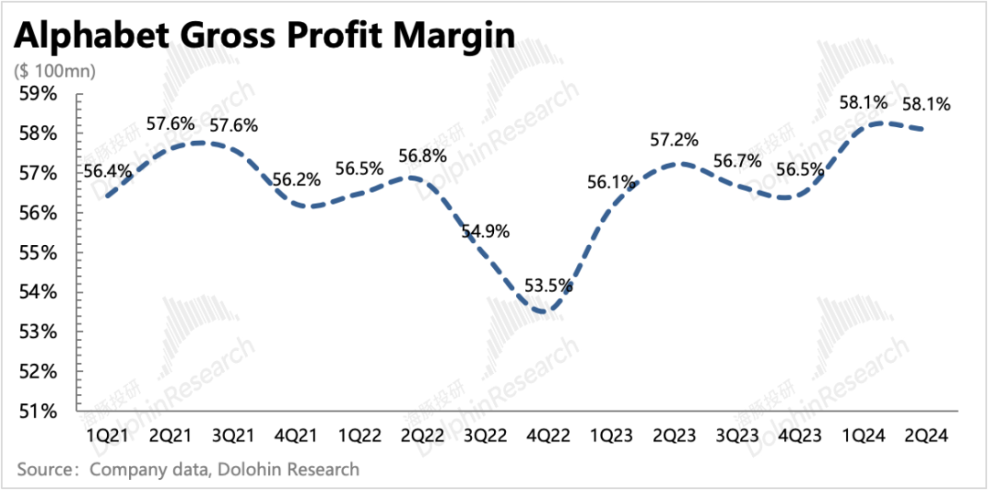 搜索广告的增长来源于零售、金融服务等行业的投放需求强劲。但搜索广告为何强劲,其实市场并没有清晰的认知,公司解释为Performance Max和AI搜索驱动广告效果的提升。并且基于这个因素,在5月I/O大会上正式推出AI overview(原SGE)后,公司对搜索业务的增长前景也非常乐观。