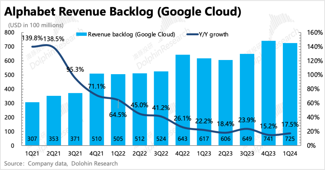 云业务是To B的,因此可能长期趋势上与本身的产品竞争力有关系,但短期的变化更容易受到当前或者上期新签合同规模的变动。因此海豚君一般还是会通过谷歌的Revenue Backlog指标来判断短期趋势。这个指标中大部分是来自云业务,因此它的变化趋势也可以视作云业务的未履约合同量的变化趋势。截至到一季度(二季度数据需要等待上交SEC的完整季报中查找,数据虽然滞后,但大趋势还是能看出来),谷歌云的积压合同规模上升态势相对稳定。同比增长17.5%,相比上季度有一定加速,环比净增额80亿,小于四季度的184亿,主要是季节性的波动。