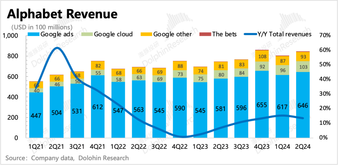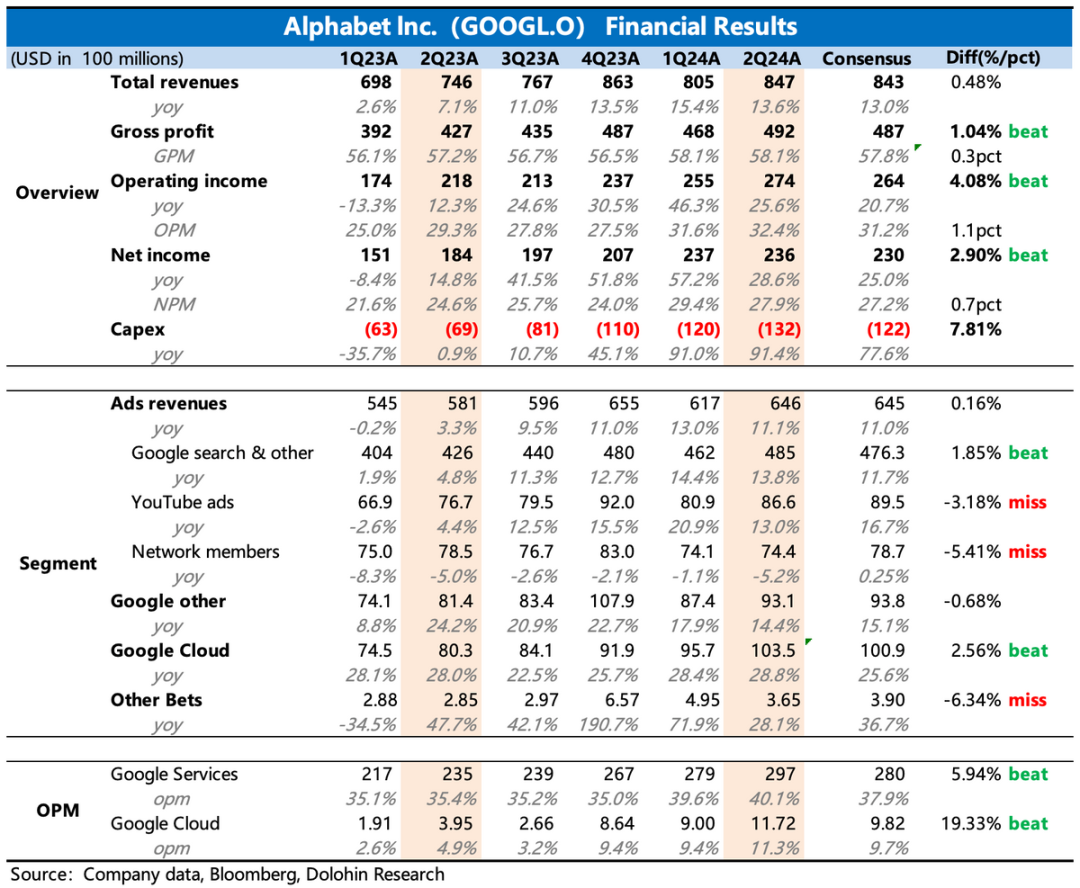 二季度谷歌整体营收847亿,同比增长13.6%,基本符合市场一致预期。二季度低基数+强劲的宏观背景,以及主要投放搜索广告的垂直领域活跃,使得整体广告收入仍然保持了相对稳定的增长。与此同时,AI浪潮下,Google云服务也实现了预期内的高增长。而YouTube订阅收入表现亮眼,也带动了其他服务收入持续高增长。