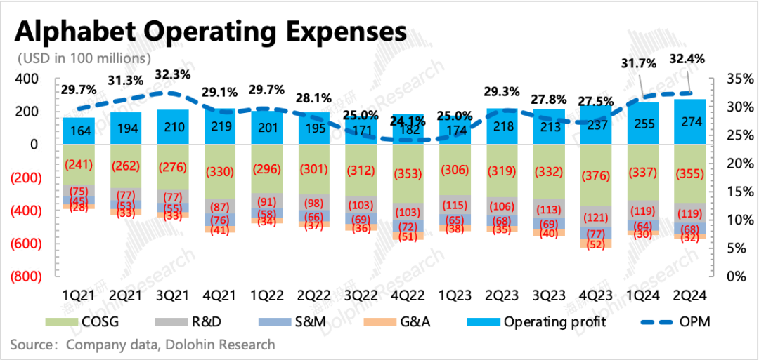 谷歌二季度的收入仅仅是达标,因此利润表现不错源于成本费用上的优化。具体拆分来看,成本优化主要体现在流量成本上,费用优化则主要是裁员、法律相关支出减少,从而压缩管理费用。从业务角度划分,Google Services经营利润率上浮了0.5pct。Google Cloud业务也重新开启盈利改善的节奏,OPM环比提升2pct。而这两块在财报前市场出于对AI成本增量的考虑,虽然也预期还会进一步改善,但都不算高。