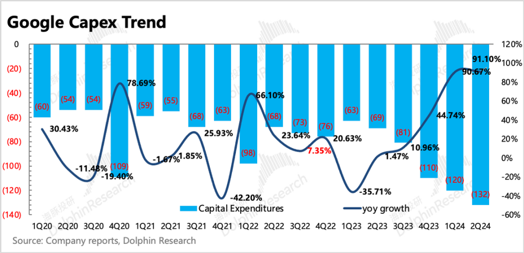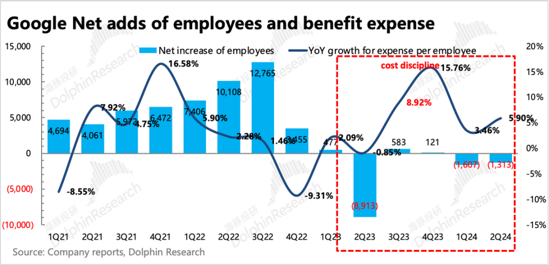 近几个季度Google Services的经营利润率持续走高到40%附近,似乎并未看到AI成本投入的影响。是市场担忧过度了吗?海豚君认为并非如此,系相关成本确认存在滞后带来。实际上,Q2已经能清晰看到研发费用重新加速增长,与此同时,资本开支也超出市场预期,并且预计下半年仍然维持单季度120亿以上的预算额度。而最直接的,公司在电话会明确指引,三季度雇员人数会重回小幅扩张,经营利润率也会受到过去几个季度不断增加投入的基础设施折旧成本影响。