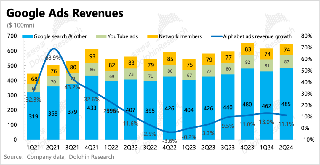 二季度广告收入646亿,整体增长11%,因为去年Q2中国跨境电商开始投放,进而带来的高基数影响,增速相比一季度略有放缓。虽然整体上符合预期,但主要来自于搜索广告的贡献,YouTube表现平平,而联盟广告收入持续恶化。