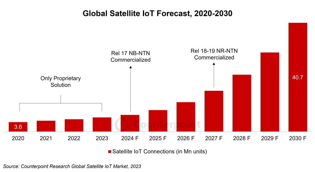 临近年末,又有研究机构对卫星物联网市场的未来发展给出积极预测——根据 Counterpoint 最新发布的《2023 年卫星物联网生态系统和市场概况报告》,全球卫星物联网连接数预计将从 2020 年的 360 万个增长到 2030 年的 4100 万个,复合年增长率为 28%。