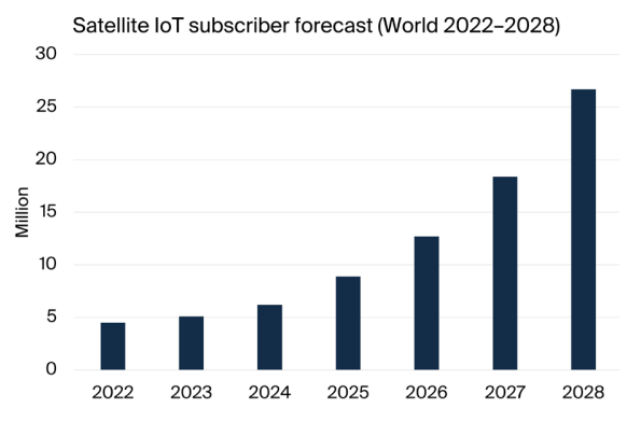 在此之前,Berg Insight 发布的卫星物联网研究报告显示,全球卫星物联网用户数在 2023 年超过 510 万,预计到 2028 年将飙升至 2670 万,复合年增长率 (CAGR) 为 39.2%。