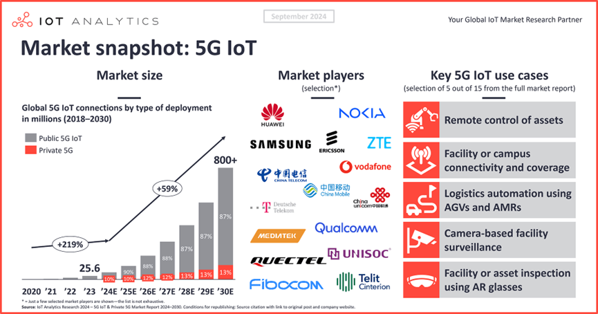 从5G商用开始,5G专网就一直是业界高度关注的领域,大量厂商入局,提供5G专网产品和解决方案,也实现了一定规模的部署落地。根据IoT Analytics的跟踪数据,截至2023年末,全球蜂窝物联网连接数超过35亿,5G物联网连接数占0.7%,为2560万。由于5G基础设施部署就绪和5G物联网应用需求的增长,预计从2024年到2030年期间,5G物联网连接的数量将以59%的复合增速增长,到2030年底将达到超过8亿连接。而相比之下,整体蜂窝物联网连接在同期的复合增长率为15%。