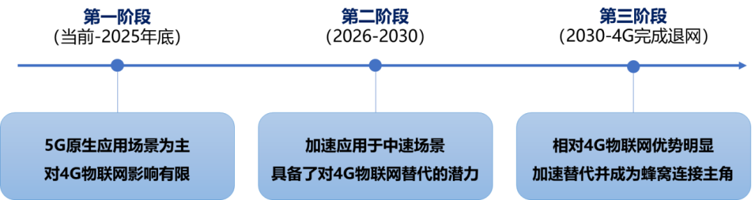 物联网智库曾在此前《5G RedCap在未来10年将经历什么样的发展历程?》一文中提出RedCap发展呈现三阶段的特征,即第一阶段5G原生应用场景为主,对4G物联网影响有限;第二阶段加速应用于中速场景,具备了对4G物联网替代的潜力;相对4G物联网优势明显,加速替代并成为蜂窝连接主角。在本次文件的指导下,RedCap的发展应该充分认识到阶段性特征,抓住阶段性的重点进行推进。