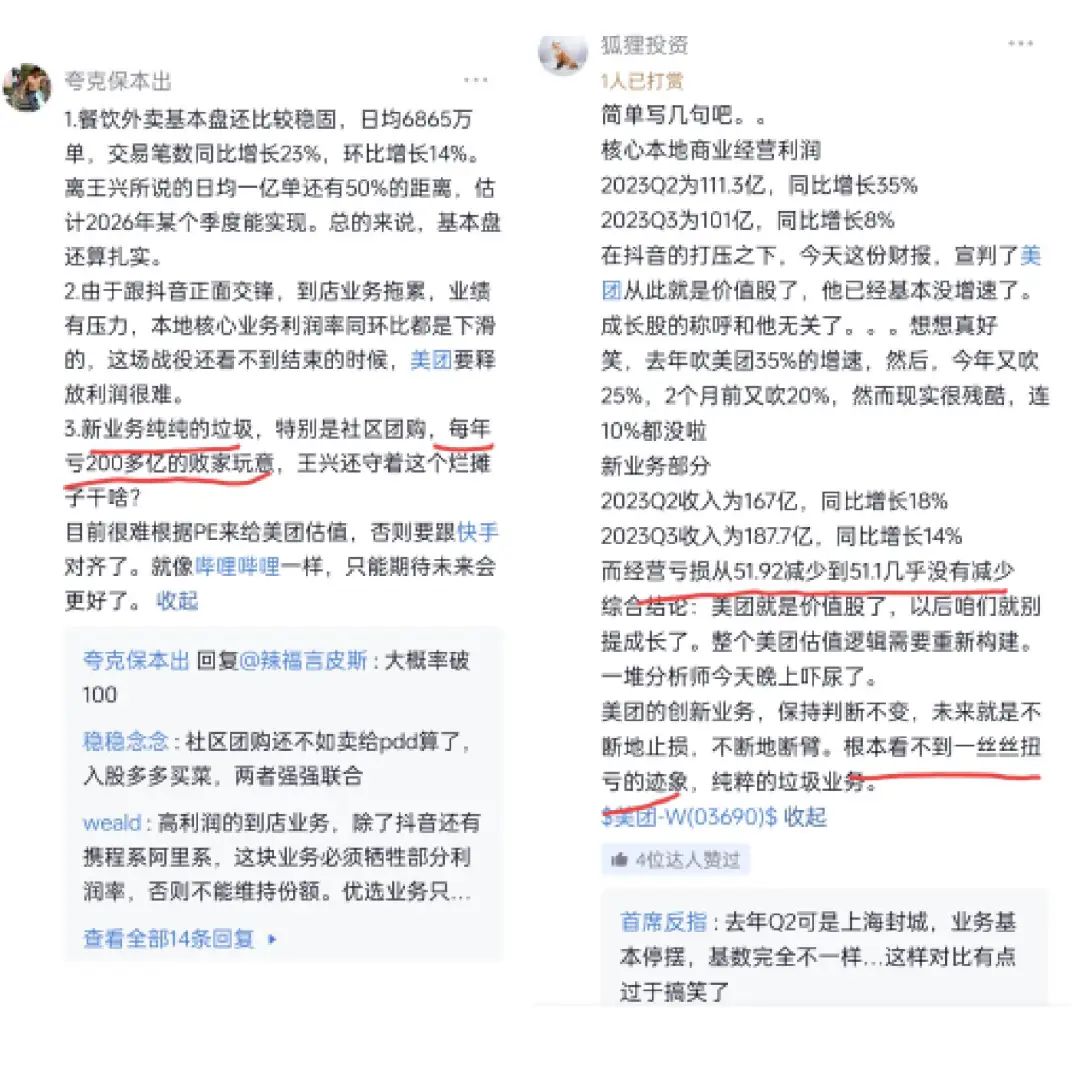 单季度50个亿的亏损并不是一个小数目,要知道,第三季度的净利润也才不到36亿。新业务的持续亏损也引起投资者的不满。有不少投资者在社交平台上吐槽,美团新业务“是每年亏200多亿的败家玩意儿”,“根本看不到一丝丝扭亏的迹象,纯粹的垃圾业务”,“如果新业务不做了,美团的利润就会增加200亿……”