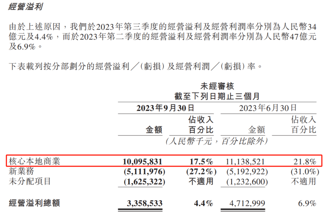 此外,新业务亏损虽然有明显的缩窄,但依旧亏得很多。财报显示,新业务在第三季度的经营亏损率从去年同期的41.6%缩窄到了27.2%,但亏损额依旧高达51个亿。