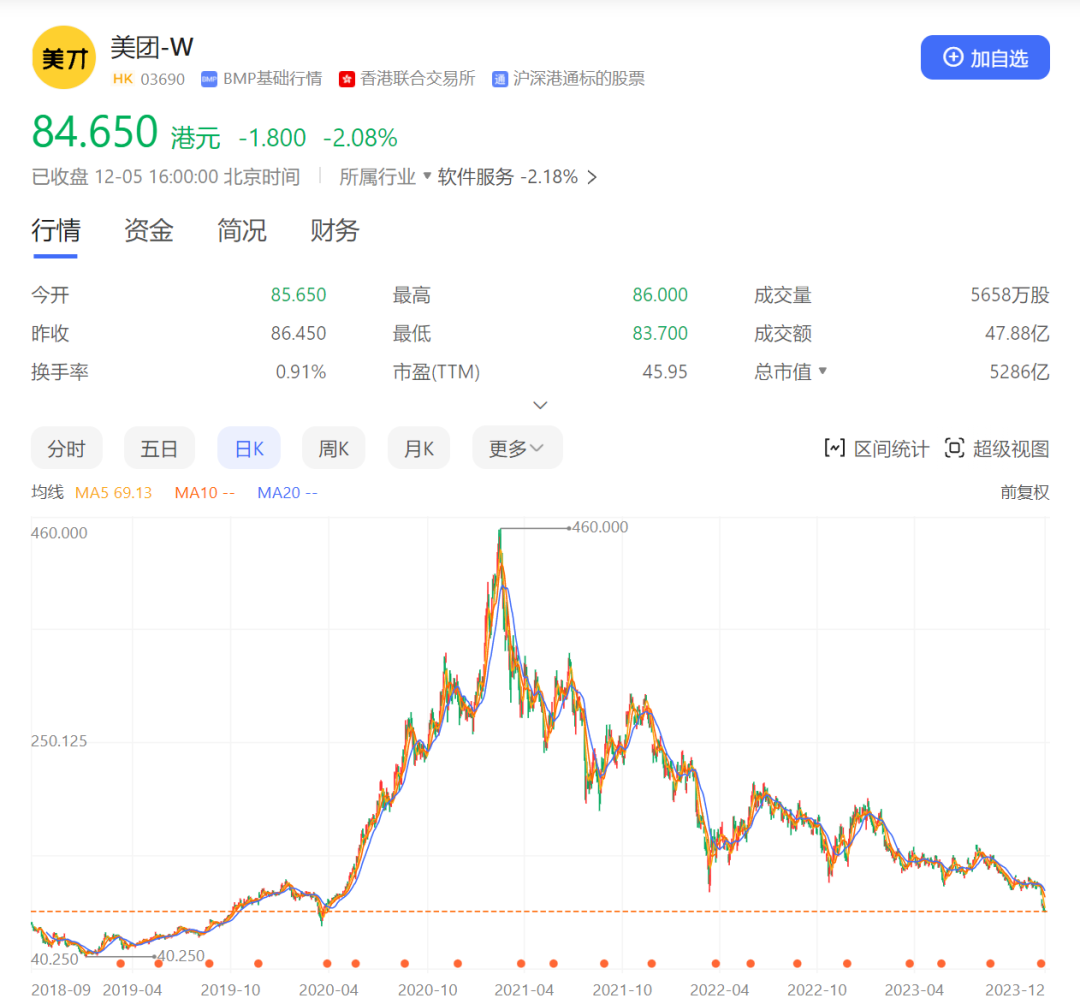 12月5日,美团港股盘中最低跌至83.70港元/股,创下自2020年4月以来最低记录。当日收盘,美团报收84.65港元,年内累计跌幅超55%,市值蒸发超6600亿港元,仅剩5286亿港元。