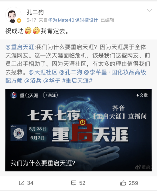 这次筹款300万的直播带货行动,能否救天涯于水火,尚且不好说。但如果能重启天涯,让老用户们把想保存的东西及时下载下来,那么至少能给天涯,给80后、90后的青春,一场体面的告别。