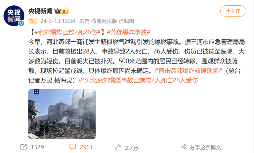 2024年3月13日,河北燕郊一商铺发生疑似燃气泄漏引发的爆燃事故。据三河市人民政府官网14日发布的情况通报,事故造成7人死亡,27人受伤。具体爆炸原因正在调查。另据网传视频,现场爆炸威力较大,波及面较广,附近建筑玻璃被震碎,路面多辆汽车受损。