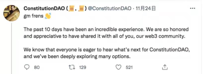 就连ConstitutionDAO的创始人也在推特上说,“我们众筹购买《美国宪法》的项目失败了,但我觉得这没关系,我们已经创造了历史,没有一家自治组织能够在短短一周时间里筹集到4700万美元,我们利用区块链技术第一次做到了自治组织大额融资,而所有的一切都只是来自于一个拍卖《美国宪法》的想法”。