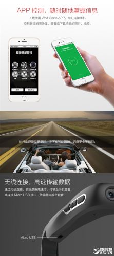 手机下载“Wolf Glass”APP,用蓝牙或二维码绑定眼镜,可以直接控制眼镜拍照,摄像,直播等多样功能。