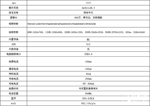 其配备800万像素一体镜头,支持自动对焦,摄像分辨率达720P,内置8G闪存,连续记录时间长达5-6小时。电池容量500mAh,宣传续航长达10天。