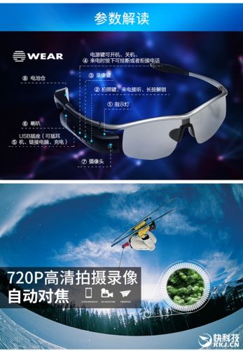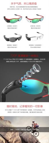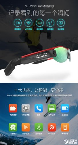 这款眼镜名为“P-Wolf Glass(悍狼)”,号称年轻人的第一台智能眼镜,支持一键高清录像、拍照,Wi-Fi传输到手机,蓝牙通话、同步直播等功能。