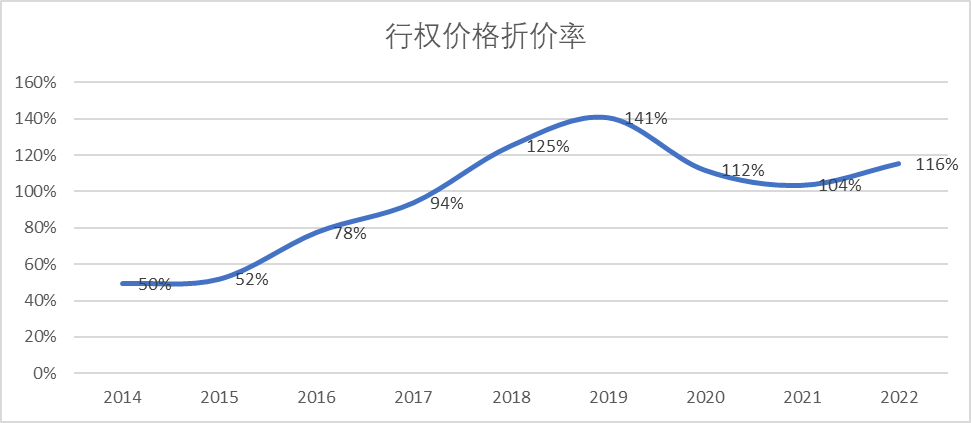 股权激励的本质是为了提升员工的忠诚度和积极性,但是丧失长期计划的股权激励,往往事倍功半,得不偿失。我们统计了2014年以来股权激励行权价格与当年成交均价的数据发现,折扣费率实际上并不高,自18年开始甚至超过了100%。